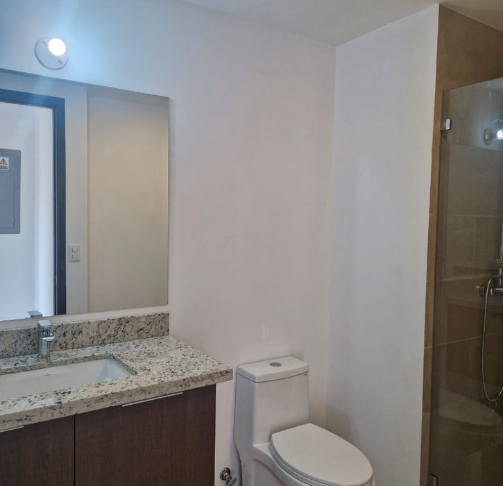 El espacio cuenta con sala y comedor con aire acondicionado, cocina equipada con barra desayunadora y campana extractora, y un baño social completo con espejo y puertas de vidrio. Una puerta corrediza separa discretamente el área de servicio, que incluye conexión 220 para lavadora y secadora y lavadero independiente.